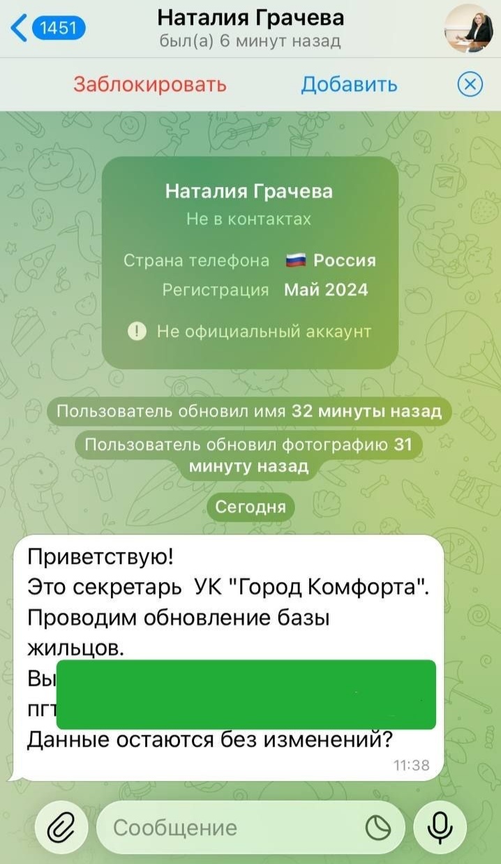 УК Город Комфорта не собирает никаких данных, и не проводит никаких обновлений списков по средствам мессенджера Телеграм.